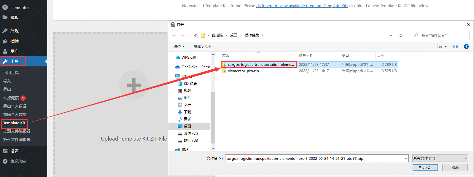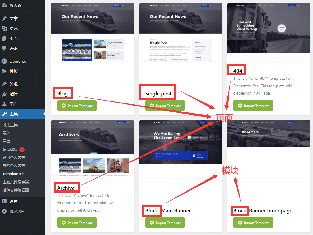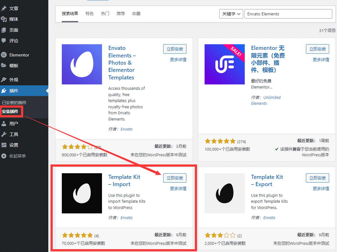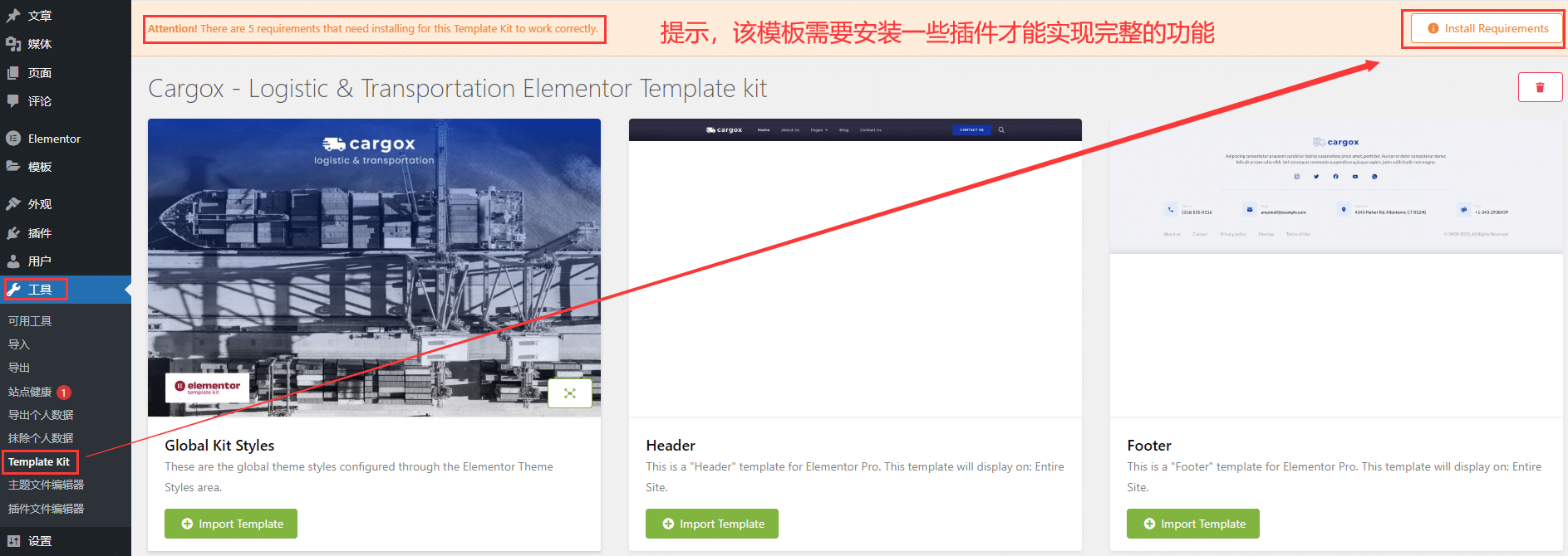 - 安装Template Kit- Import 插件,并启用,用于elementor模板上传
