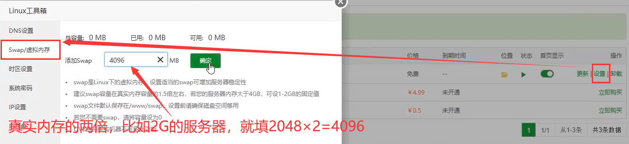 - 增加虚拟内存,提高可靠性:安装Linux工具箱=>Swap/虚拟内存(填入2倍的真实内存)