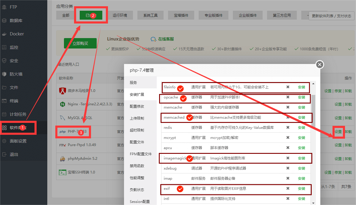 - 安装PHP扩展:fileinfo、opcache、memcached、imagemagick、exif