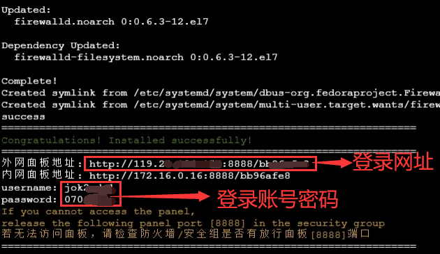 安装成功后,会出现宝塔登录网址、账号、密码