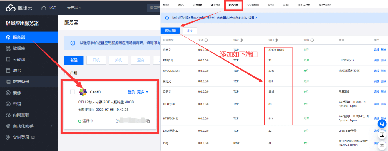 - 开放防火墙端口:进入轻量应用服务器=>选择防火墙,添加规则(开放如下端口 443、80、888、8888、20、21、、3306、39000-402000)