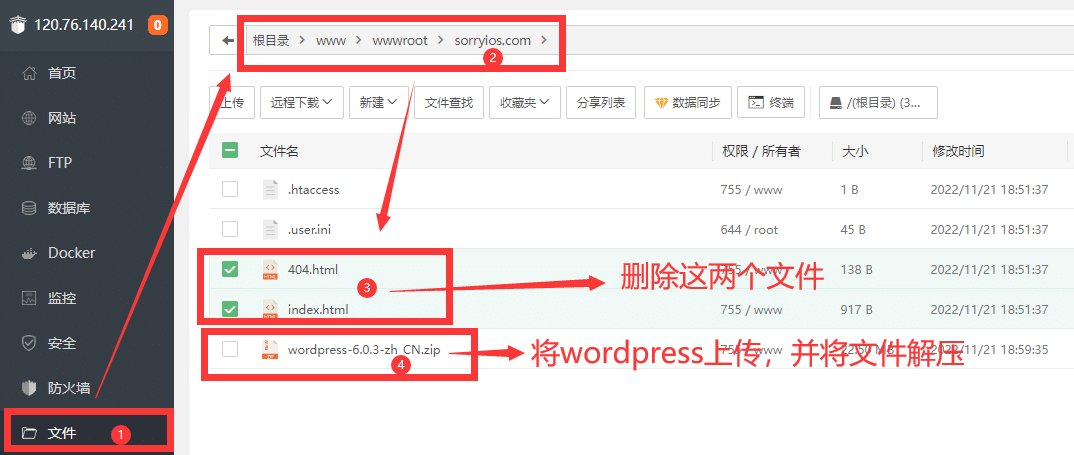 删除404.html、index.html,上传wordpress,并解压wordpress