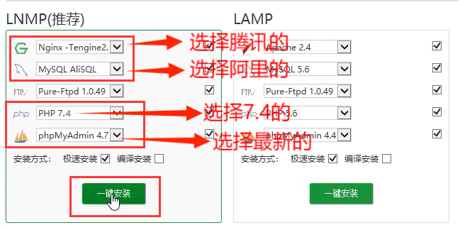 - 安装LNMP套件(选择Nginx-Tengine、MySQL AliSQL、PHP 7.4、phpMyAdmin选择最新的),点击一键安装,等待安装成功(30min-60min)