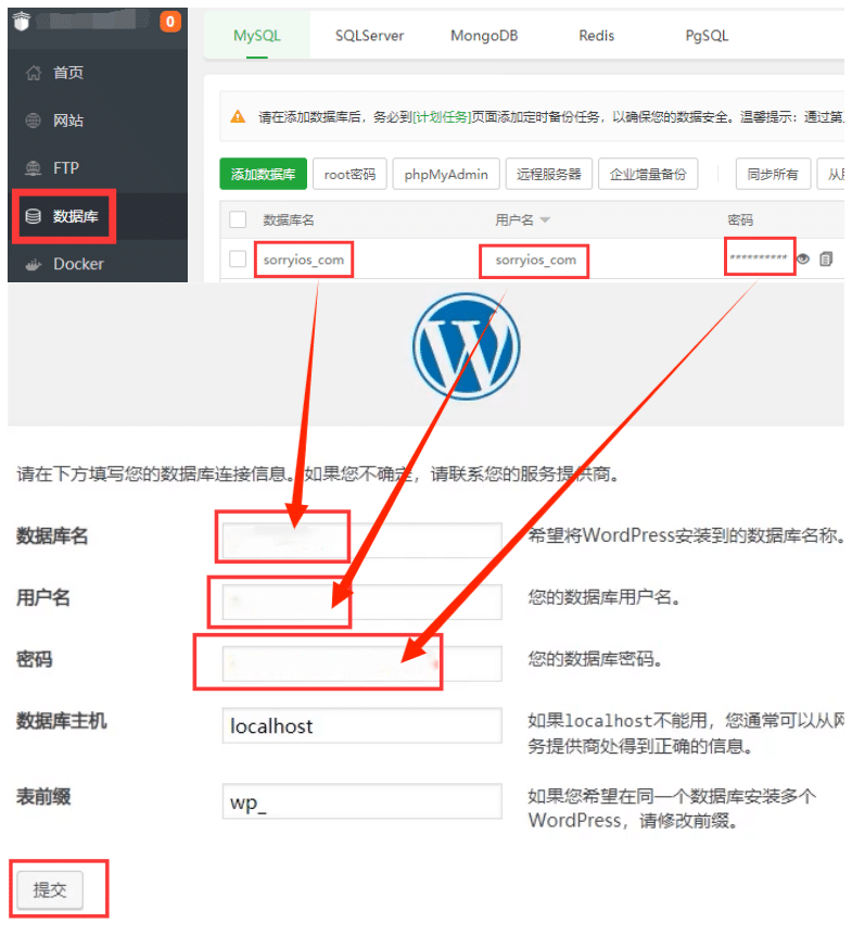 - 安装wordpress:浏览器输入你的网址,填写数据库名、账号、密码